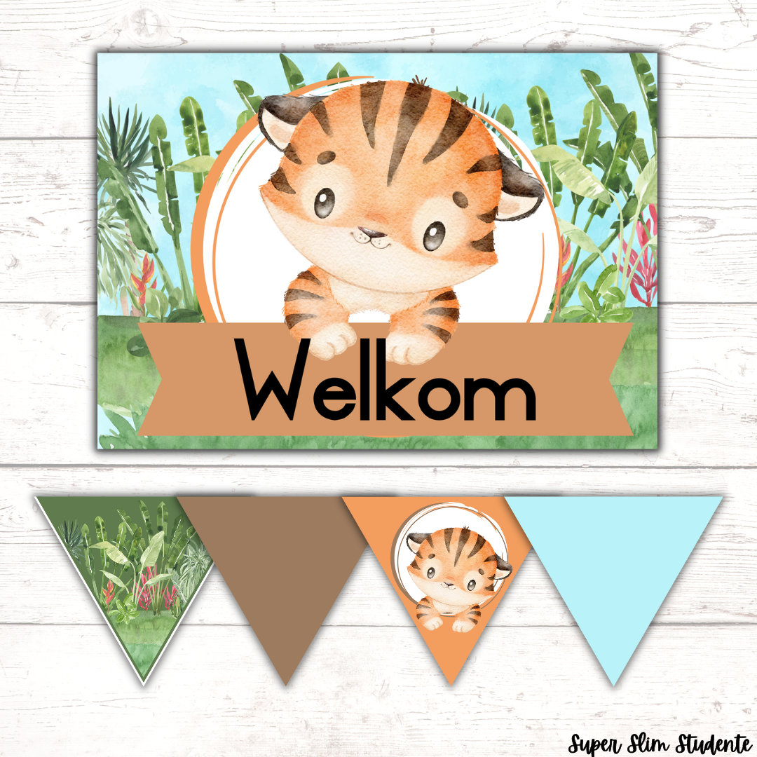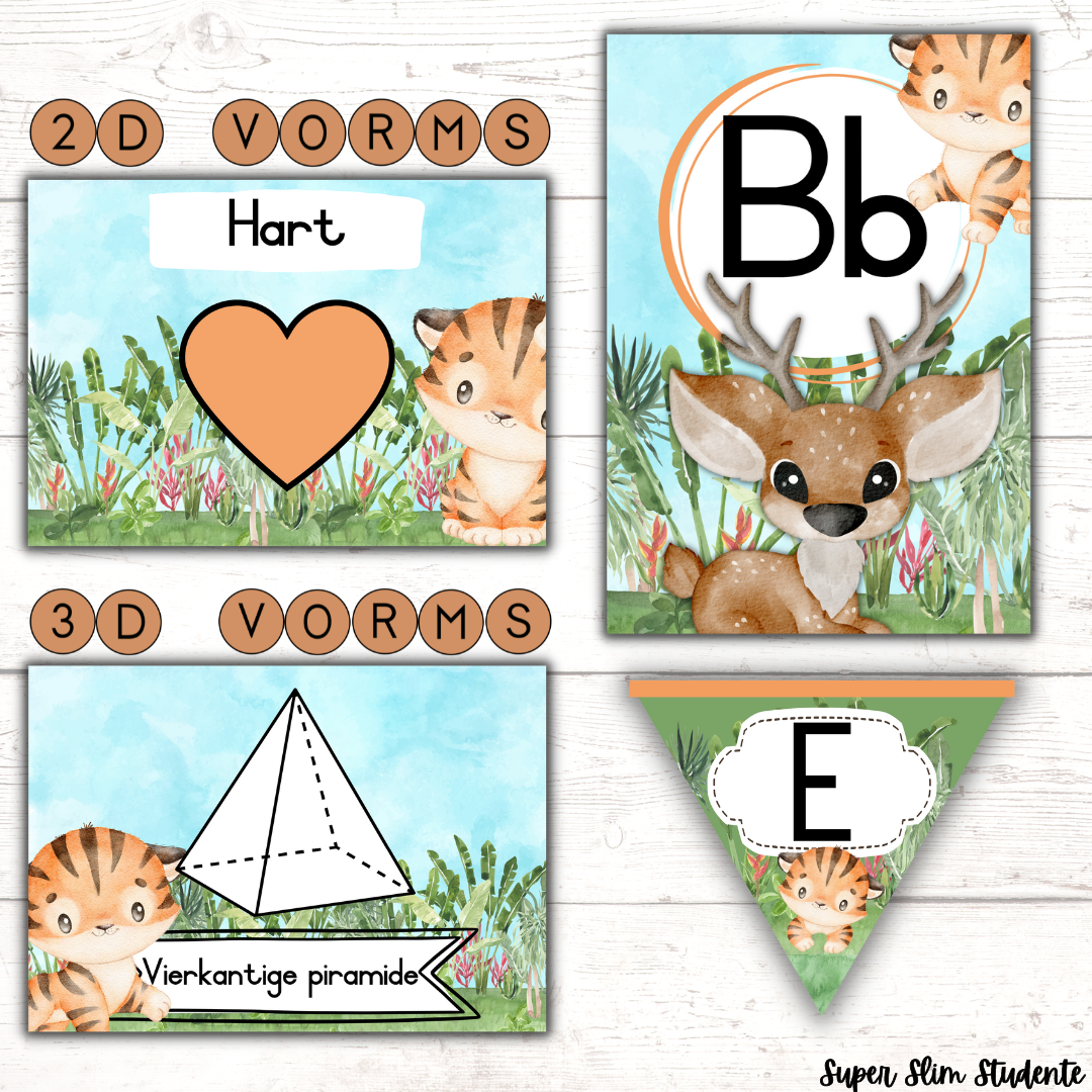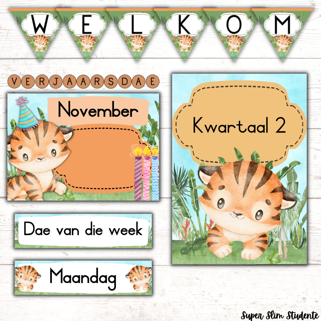 Afrikaans: 16 Klaskamer dekor items in PDF formaat: -Alfabet -Verjaarsdae Banner -Verjaarsdae kaarte -Getallelyn 1 tot 100 -Tema Vlaggies -Voorblaaie (Kwartaal 1 tot 4) -Kleure Banner -Kleure -Dae van die week kaartjies -Getalle 0 - 20 -2D Vorms Banner -2D Vorms -3D Vorms Banner -3D Vorms -Welkom Banner Vlaggies -Welkom Deurkaart