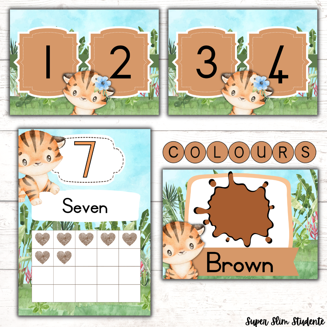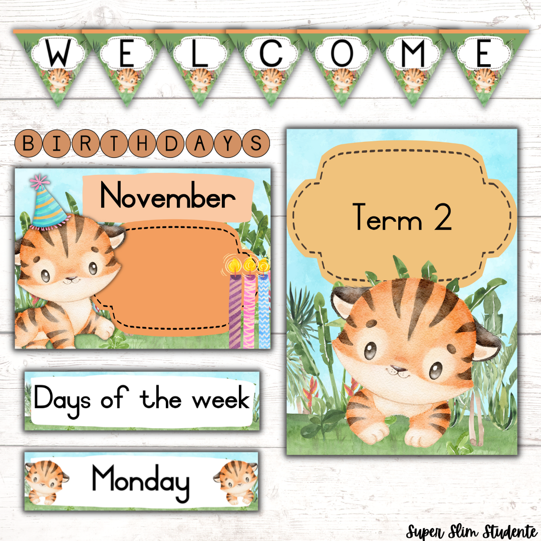 English: 16 Classroom decor items in PDF format: -Alphabet -Birthdays Banner -Birthday Charts -Number line 1 to 100 -Theme Flags -Cover pages (Term 1 to 4) -Colours Banner -Colours -Days of the week cards -Numbers 0 - 20 -2D Shapes Banner -2D Shapes -3D Shapes Banner -3D Shapes -Welcome Banner Flags -Welcome Door Poster