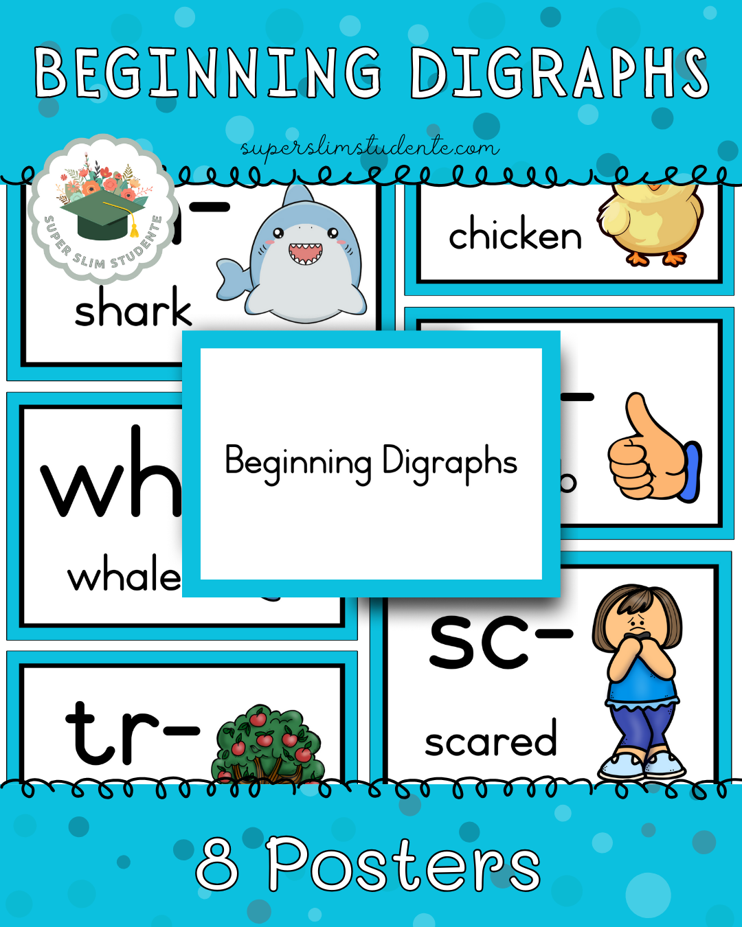 8 Posters in PDF format with beginning digraphs sh, ch, wh, th, tr, sk, sc